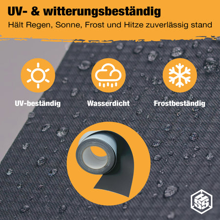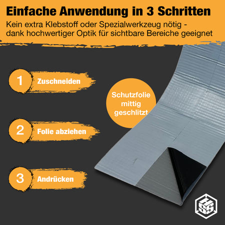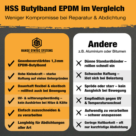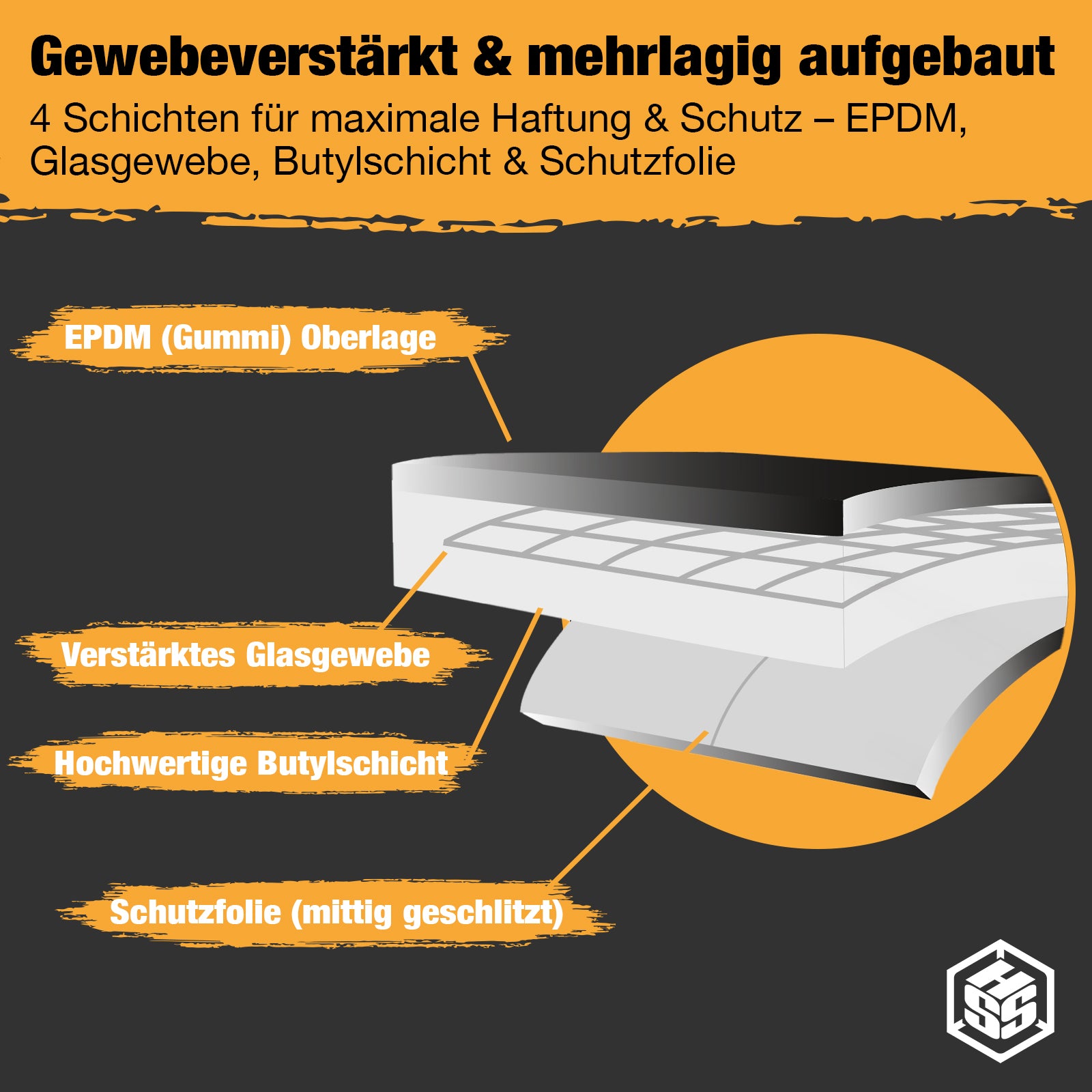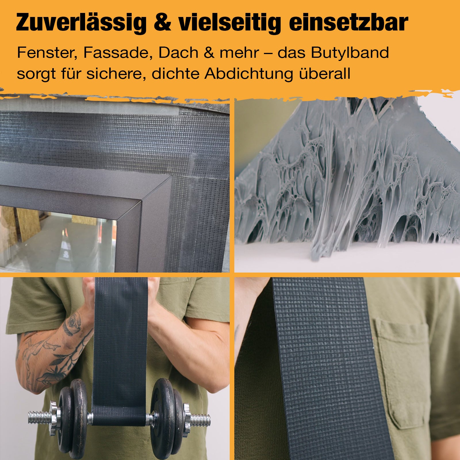 Das Butyl Abdichtungsband ist ein selbstklebender, wasserdichter EPDM-Abdichtungsstreifen; unterseitig mit einem Glasgewebe verstärkt und mit einer selbstklebenden Schicht aus Butylkautschuk sowie einer Trennfolie versehen, die zur einfacheren Verarbeitung mittig eingeschnitten ist. Das Band dichtet Nähte und Fugen luft- und feuchtigkeitsdicht ab, ist dauerhaft flexibel und einfach zu verarbeiten. Außerdem haftet es auf saugenden und nicht saugenden Untergründen.