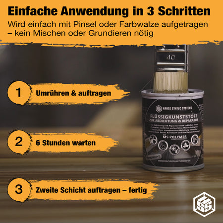 • Witterungsbeständig: Der ausgehärtete Flüssigkunststoff schützt die Problemstelle langfristig vor Feuchtigkeit und Sonneneinstrahlung.