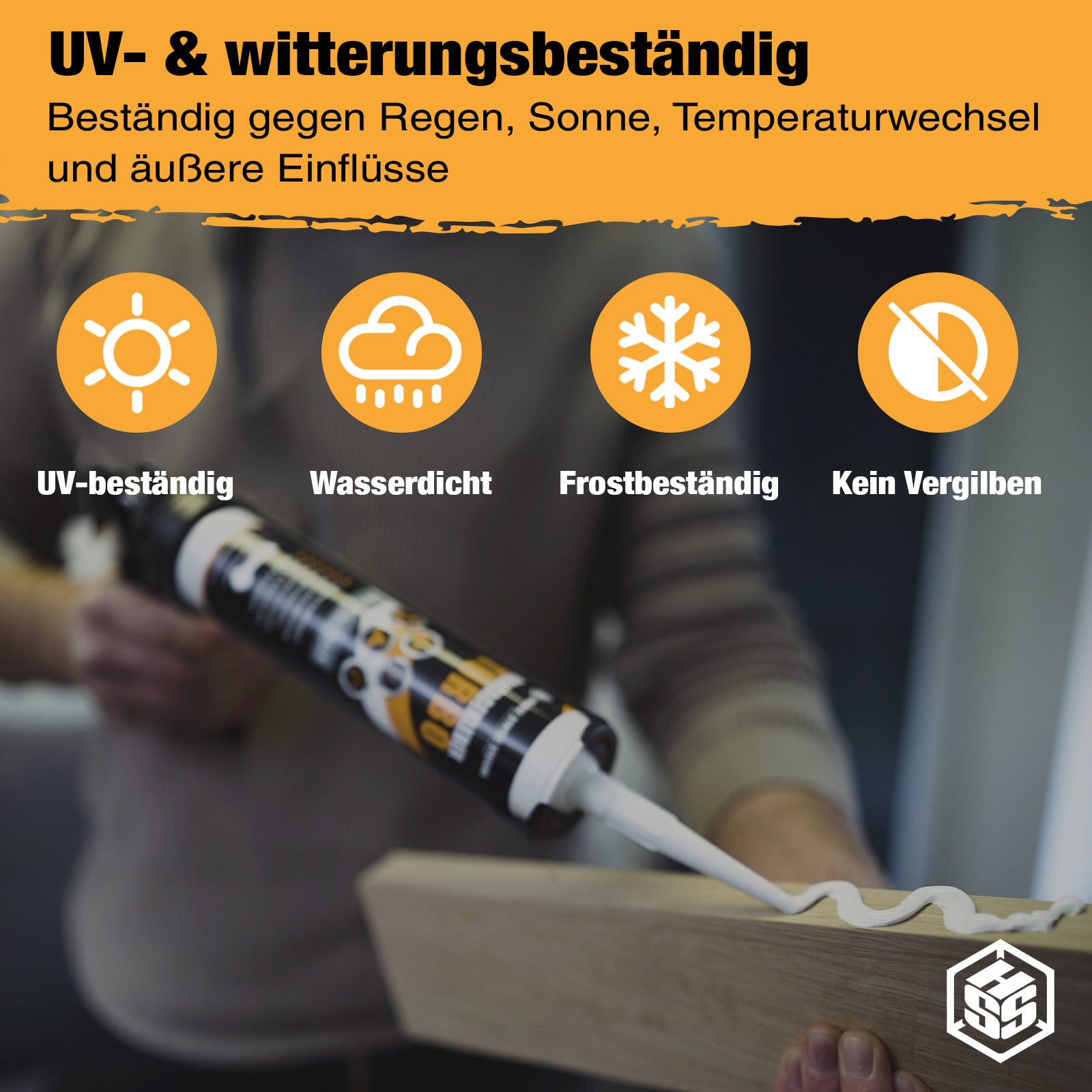 Der Kleber ist frei von Lösemitteln und Isocyanaten und überzeugt durch seine UV- und witterungsbeständige Zusammensetzung. Dank der hydrophilen Eigenschaften der MS-Polymere härtet er besonders schnell – auch auf leicht feuchten Untergründen.