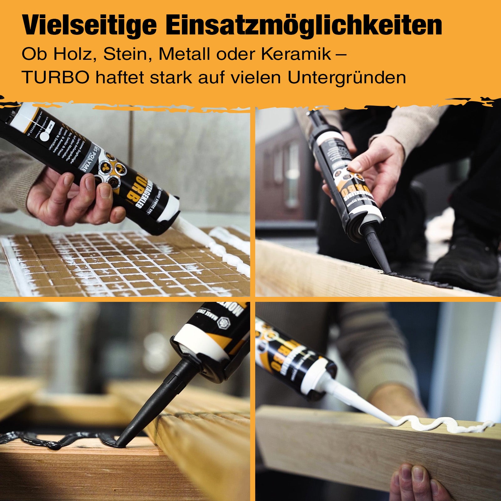 Extrem starke Haftung:Mit einer beeindruckenden Haftkraft von 600 kg/m² sorgt der Montagekleber TURBO für besonders starke Verklebungen auf nahezu allen Oberflächen.